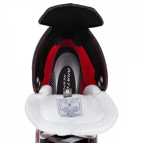 Внутренний язычок имеет двухкомпонентную конструкцию и внутреннюю футеровку из белого войлока толщиной 7 мм. Такая конструкция защищает верхнюю часть ноги от ударов и сдавливания шнуровкой, но при этом сохраняет отличную подвижность ноги при сгибании ее вперед. Внутренняя стелька CCM Anatomical Response обеспечивает правильное положение стопы внутри ботинка и создает необходимую поддержку. Вогнутая пластиковая подошва с вентиляционными отверстиями способствует созданию необходимой устойчивости, эффективной передаче энергии при движении. Вентиляционные отверстия в подошве обеспечивают быстрое охлаждение ноги и удаление из внутреннего пространства излишков влаги и тепла.