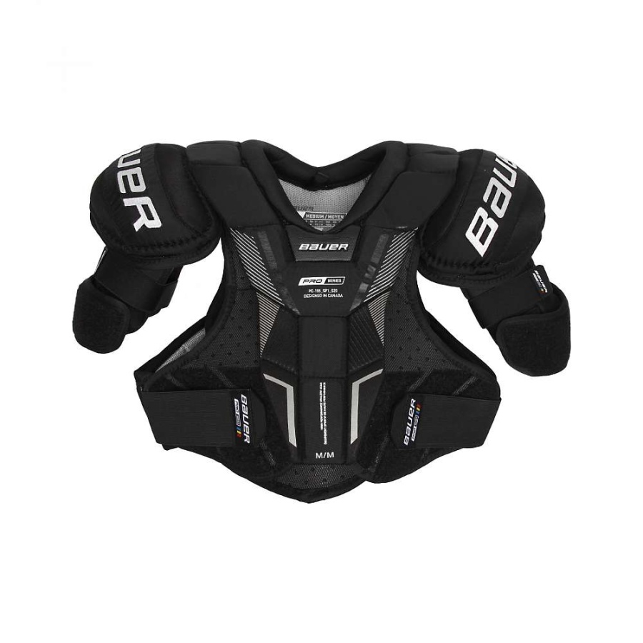 Нагрудник Bauer PRO SERIES SR. В области груди и позвоночника используются удлиненные плиты повышенной плотности, а также съемная подушка для защиты области живота и ребер. Грудь защищает шарнирная сегментированная плита. Анатомические плечевые чашечки обладают высокой степенью защиты. Область бицепса надежно облегает регулируемая система защиты, обеспечивающая максимальную легкость и подвижность. Гидрофобный материал в комплексе с противомикробной технологией, гарантирует правильный воздухообмен, быстрое испарение влаги и отсутствие неприятного запаха. Подкладка THERMO MAX выполнена из влагоотталкивающего материала, что гарантирует постоянную сухость и комфорт. Традиционная регулируемая система крепления обеспечивает удобную посадку.